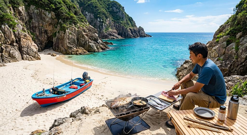 【最高】ボートでしか行けない秘密の砂浜で、釣りたての巨大魚を食らうDAYキャンプが男の夢すぎたwww
