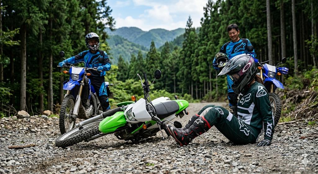 【悲報】林道デビューした奥様、開始3分で心がポッキリ折れてしまうwwwこれは引退不可避か!?
