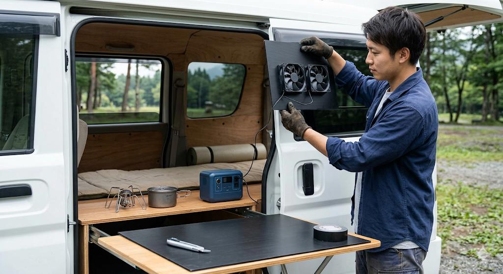 【神業】エブリイの車中泊用「DIY換気扇」がクオリティ高すぎて職人レベルな件www